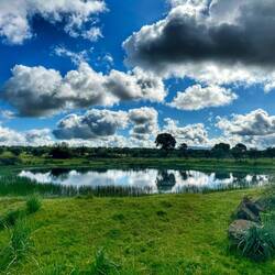 Außerhalb vom Ort ein kleiner Teich mit großen Pappeln. Hübsch anzusehen. Erneut weiter hügelig ging es durch die weite grüne Landschaft. Wir hörten immer wieder das Rufen des Wiedehopf „Bububub“. Später sahen wir ihn dann noch auf einer Antenne eines Hauses sitzen. Nach dem wir zwei große Bauernhöfe und einige Gatter durchquert hatten, überholten wir Angela und Dirk. Sie genossen langsam gehend den Weg, aber auch, weil Angela eine kleine Entzündung im rechten Fuß hatte.