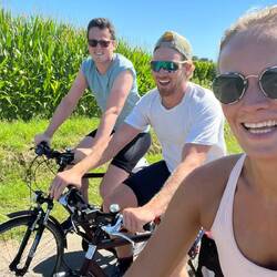 The sunshine was back and this was the most gorgeous ride through the French countryside. Quaint little towns, winding country roads through vineyard after vineyard and fields of sunflowers. 🌻 Dreamy. A quick wine tasting, a few wrong turns (sorry James) and a spot of off roading and we were in the lovely town of Sainte Foy La Grande munching on steak and sipping wine by the river at Brasserie Du Boucher. A cracking find! The accom this night was the best of the trip - La Carreterie - Maison de Famille - a gorgeous guest house in the fields with a pool, massive garden, beautiful French style rooms and amazing breakfast. Heaven. We chilled by the pool, cycled back into town for a local dinner, then joined the local party with 4 bottles of wine in hand. 🥴