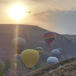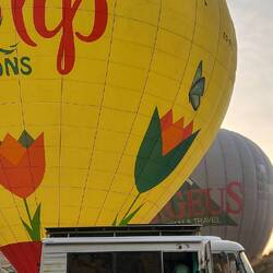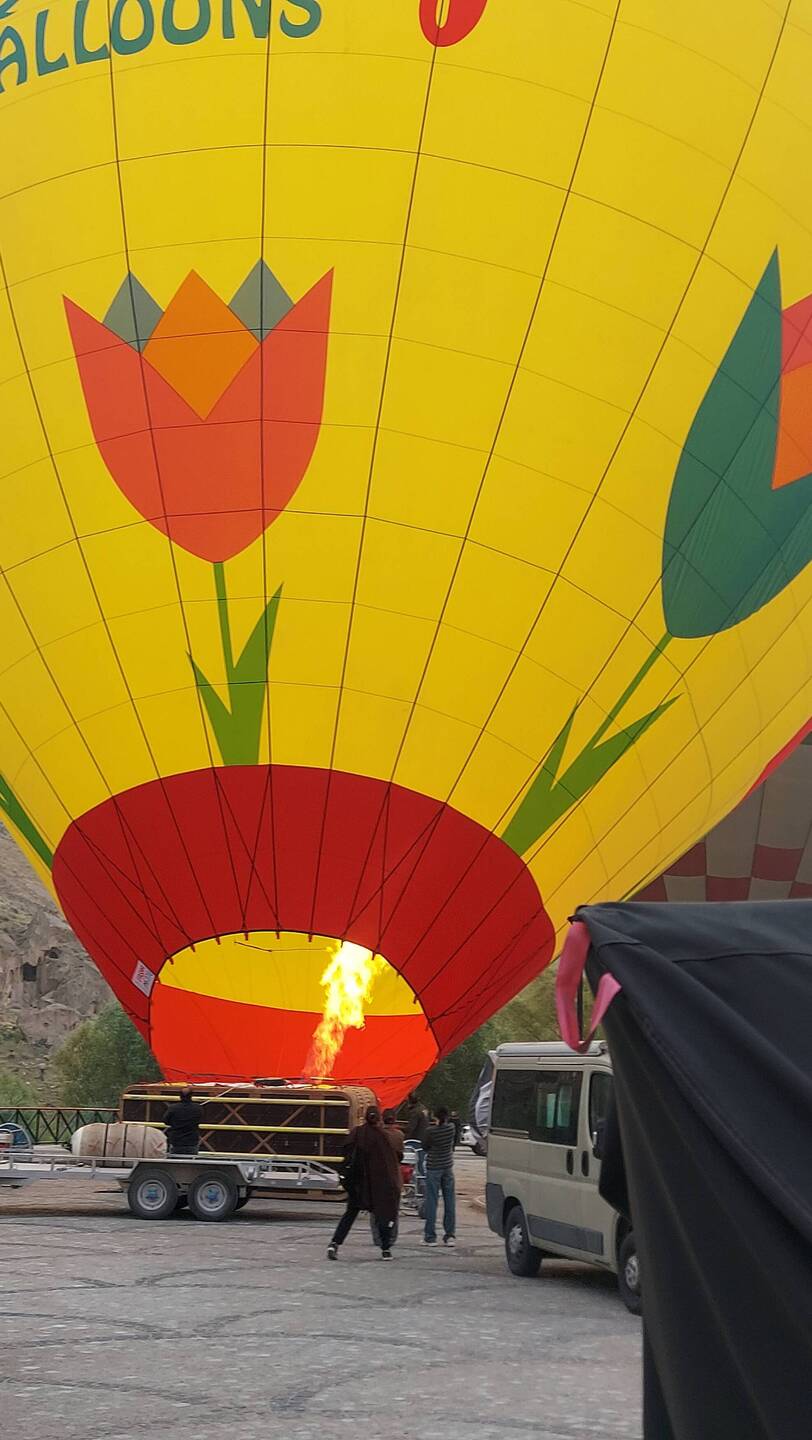 Der nächste Morgen startet selbst für unsere Verhältnisse früh. So um 4:30 Uhr. Baustellenarbeiter? Nein. Als es hell wird sehen wir Anhänger mit Ballonkabinen. Dann geht's schnell. Routiniert wird aufgebaut. Parallel rollen zwei Kleinbusse vor. Dann geht's auch schon los. Mit mächtig Getöse steigen die Ballons auf. Einige weitere, welche wir gar nicht sehen konnten, starten ebenfalls🎈!