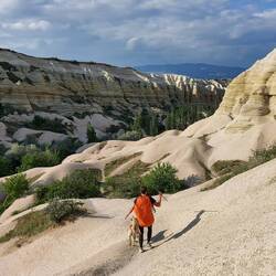 Wir gehen dann besser mal wandern😉! Begleitet werden wir von einem großen Kangal Bären und einer Hündin. Es geht durch das Love Valley ins Rose Valley und über Göreme ins Tauben Valley. Alleine ist man hier nicht, aber abseits der Hauptorte halten sich die Touriströme in Grenzen. Landschaftlich ist es schön, mit spannenden Felswohnungen und Formationen.