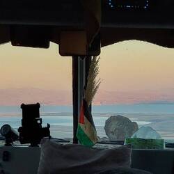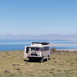 Weiter oben enden die geteerten Straßen und es geht offroad weiter. Rekordverdächtig steil, aber Robur meistert dies sehr lässig. Wir gelangen zum Basislager, wo die Bergsteiger, wenn vorhanden, gerne campieren. Die Platz ist ein Traumplatz. 800m über den Van See ist der Blick fantastisch. Ein weiteres Auto parkt ebenfalls hier. Das Wetter verschlechtert sich gegen späten Nachmittag und Sturm kommt auf. Gekocht wird drinnen. Die Tür bekommt man nur noch unter Gefahr auf. Böen bis 100 Kmh schütteln Robur ordentlich durch. Graupel & Regen folgen. Puh! Dann kommt eine einzelne Person den Berg herab. Das war sicher kein Spaziergang. Wir unterhalten uns kurz durch den Türspalt. Er sagt früh starten und das Wetter beobachten, dann fährt er. Wetter beobachteten? Wir sind mittendrin😅!