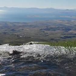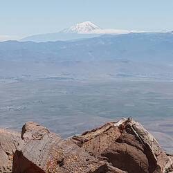 Wir kreuzen Bäche mit Eiskristallen. Es wird immer kälter und wir gewinnen schnell an Höhe. Auch der Ararat rückt ins Bild. Der Ausblick ist fantastisch. Dann fehlen noch 250 Höhenmeter. Es wirkt wie ein Berg auf dem Berg. Der Kraterrand hat große Schneefelder und ist aus losem Geröll. So langsam verstehen wir, warum auf Bildern die Leute einen Helm tragen😅!