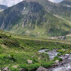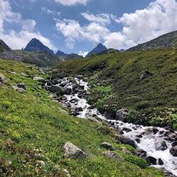 Der tosende Bach ist mein ständiger Begleiter. Die Wiesen sind grün und der Frühling in vollem Gange. Die Hänge blühen in den unterschiedlichsten Farben. Ich selbst bin etwas aufgeregt. Kann ich es schaffen? Es geht immer weiter nach oben. Die Aussicht ist fantastisch und meine Stimmung nimmt ebenfalls fahrt auf.