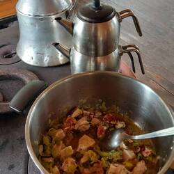 Nachdem die Gastgeberin vom Melken kommt gibt es Abendessen. Ein Eintopf beim dem ich die Stunden zuvor der Rührmeister gewesen bin. Mit Liebe gerührt😃.