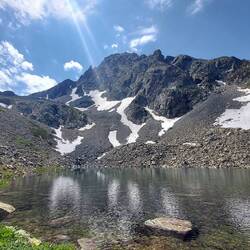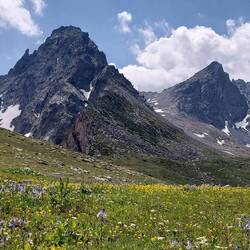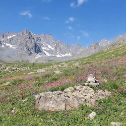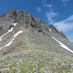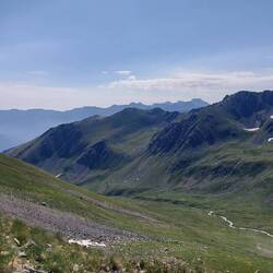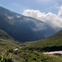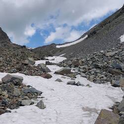Die ersten Schneefelder folgen und mit ihnen Bärenspuren. Frische Bärenspuren. Das Hochgebirge und der Pass mit 3200m Höhe sind erreicht. Hier ist es ruhig. Ein paar Vögel zwitschern. Sonst ist nichts zu hören. Dann und wann störe ich die Ruhe. Es ist ganz gut, wenn die Bären von meiner Anwesenheit wissen. Spontane und nahe Begegnungen sind zu vermeiden. Singen hilft. Ich mach mir die Welt... von Pippi Langstrumpf scheint mir geeignet. Zudem laute rufe wie es die Hirten tun. Mit Blick auf einen der Bergseen ist es dann tatsächlich soweit. Eine Bärenmutter mit ihren zwei Kids ist zu erkennen. Die Tiere sind weit weg. Bestimmt 2Km. Die Bären sind gechillt und lassen sich nicht stören. Für mich war es klar, dass solch Begegnungen sehr wahrscheinlich sind. Daher bin ich unaufgeregt. Was wäre die Wildnis ohne wilde Tiere?