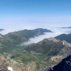 Was folgt ist die Belohnung. Ein Ausblick in eine fabelhafte Bergwelt. Was bietet dieses wunderschöne Gebirge für riesiges Potential! Soweit das Auge reicht. Monate könnte man in der Wildnis wandern. Es ist wunderschön hier oben zu stehen und zu sehen, wolang einen die letzten Tage führten. Die tiefhängende Wolkendecke aus Richtung des Schwarzen Meeres ist ebenfalls beeindruckend. Ich mache Pause und esse Bananenpüree mit Haferflocken. Gärt mittlerweile etwas, aber das tut Bier ja auch😂!