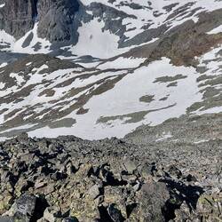 Hinunter kommen sie alle, also los. Ich versuche diesmal den korrekten Weg zu finden. Ein Schneefeld blockiert diesen jedoch. Mein Respekt für die ersten 300 Höhenmeter, iin der steilen Abwärtsbewegung, ist nach wie vor groß. Ich teile mir den Rückweg in Schlüsselstellen ein. Das macht das Vorhaben mental einfacher. Nach und nach platzen die Knoten und ich passiere die feuchte Kletterpassage. Alles gut😊!