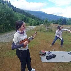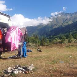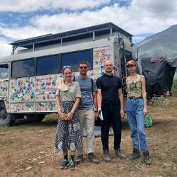 Da wir lediglich 25m vom Hauptwanderweg Georgiens, dem kaukasischen Trail, stehen, können wir uns einen guten Eindruck von der Frequentiertheit machen. 100 Wanderer sehen wir mindestens am Morgen. Wir bekommen von Israelis ein Konzert gespielt und Besuch von Deutschen aus der Altmark. Vier Moskauer kommen zu uns und sind von unserem Projekt Händeverbinden begeistert. Der Kontakt zu den Leuten macht Spaß und es gibt einige Handabdrücke. Eins stellen wir aber auf unser vorausgegangen Wanderung auch fest. Wenn wir wandern brauchen wir keine anderen Menschen. Wir sind mittlerweile tief mit der Natur verwurzelt. Die Wildnis ist das was uns innerlich bewegt und antreibt. Das finden wir hier nicht.