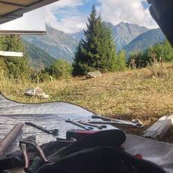 Der Sonntag ist bekanntlich Tag der Arbeit und so geht es morgens früh an die Bremsen. Da die folgenden Pässe heftige Gefällestrecken parat halten werden, halten wir funktionierende Bremsen für ganz charmant. Marcus unterstützt mich auf diesem völlig unbekannten Terrain via WhatsApp.
