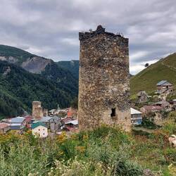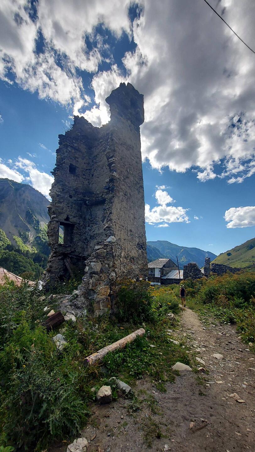 Am Abend gelangen wir über einen steilen Abstieg retour ins Dorf. Hier führt der Kaukasien Trail durch und viele Wanderer trudeln grade in die sehr einfachen Unterkünfte ein. Das Dorf selbst ist hübsch gelegen und die Wehrtürme sind beeindruckend. Fast jede Familie hatte einen. Aufgrund von Ehrenmorden, Blutrache und sonstigen Kriegen war das vielleicht ganz sinnvoll. Heute verfallen die meisten Türme. Kaum jemand kann sich die Erhaltung leisten.