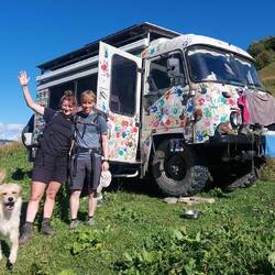 Nach nur 200m steht ein winkendes Pärchen auf dem Weg. Sie stoppen uns und erklären uns woher wir uns kennen. Und tatsächlich, vor ca. 4 Monaten waren wir am Euphrat und tauschten Telefonnummern mit einem Kurden. Dieser rief uns Wochen später an. Genau mit diesem Pärchen an seiner Seite. Wir telefonierten und sagten den zwei deutschen Reisenden, macht Euch bemerkbar wenn ihr einen Bus mit Handabdrücken seht. Hier standen Marie & Daniel nun. Gesehen haben wir uns noch nie, sind uns aber direkt sympathisch. Es gibt also weitere Handabdrücke & wir tauschen Telefonnummern😊.