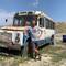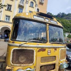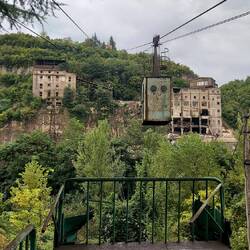Die Häuser scheinen teils unbewohnbar. Der Schein trügt jedoch und so ist die Stadt sehr wohl lebendig. Pema, ein französisches Liftbau Unternehmen, errichtete kürzlich einige neue Seilbahnen. Mit 0,30€ für die Hin- und Rückfahrt sehr günstig. Wir nutzen die Bahn zum Sanatorium als Ausgangspunkt. Oben angekommen wird unser Weg mal wieder abenteuerlich. Wir durchqueren einen großen Tagebau, werden Zeuge eines Trauermarsches, bei dem die verstorbene Person, im offenen Sarg, durch das Dorf getragen wird. Schließlich erreichen wir eine alte Seilbahnstation. Diese wird aktuell saniert. Die Bauarbeiter, ja hier wird auch Sonntags gearbeitet, stört unser Besuch überhaupt nicht. Wir stapfen durch die Baustelle und schauen uns um. Die Häuser im Umfeld sind völlig abgerockt. Ein Mann aus dem EG ruft mich heran und möchte mir nen Schnaps eingießen. Ich danke ab.