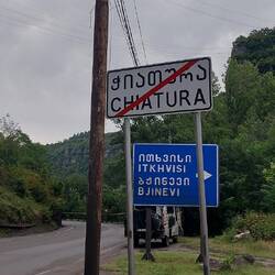 Danach geht's zur Touri Info. Dort gibt es Trinkwasser. Zudem erhoffen wir uns ein paar nützliche Tipps zu Tschiatura. Die Touristen Information ist brandneu und einladend. Allerdings beherbergt diese ein WC und eine Veranda mit einer gemütlichen Bank. Dies ruft die schnapstrinkenden Anwohner, bereits zur Mittagszeit, auf den Plan. Die Dame ist sichtlich erschüttert, als uns einer der mega besoffenen Typen in ihre Räumlichkeiten folgt. Er hat viel zu erzählen. Was auch immer😅. Die arme Frau ist peinlich berührt. Da baut der kleine Ort extra ein schöne Touristen Info um sich bestmöglich zu präsentieren und dann sowas😂.