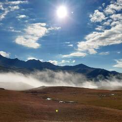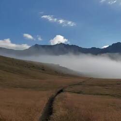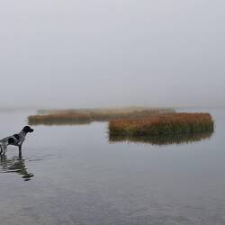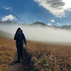 Wir ziehen weiter. Ein Abstecher treibt uns zu drei Seen. Nebelschwaden ziehen auf nun 3000m Höhe über das Wasser. Herbstlich ist es. Herr Linguini und ein Jagdhund, dieser begleitet uns bereits seit dem Start, gelangen aneinander. Eine wilde Beisserei beginnt. Wir können nichts tun. Am Ende versenkt Herr Linguini den Widersacher komplett im See. Außer kleineren Wunden passiert zum Glück nichts. Wer das Sagen hat ist zumindest geklärt. Der Jagdhund trägt die Rute nun einiges niedriger.