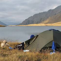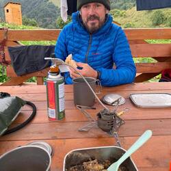 Wenig später der Black Rock Lake. Dieser trennt Georgien in seiner Mitte zu Russland. Er wirkt etwas wie einer dieser modernen Hotelpools. Wie ein Infinity Pool. Hinter dem See fällt die Bergwelt einfach steil ab. Der Anblick ist klasse und wir entscheiden hier zu übernachten. Das Wetter klart etwas auf und die Kulisse ist wunderschön😍. Nach einem Bad im kühlen Nass gibt es Asia Nudeln. Nachbarn gibt es auch. Insgesamt fünf weitere Wanderer verbringen hier die Nacht🌟.