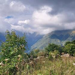 Am nächsten Morgen starten wir bereits oberhalb der Baumgrenze. Auf 2800m angekommen öffnet sich der Blick in Richtung Russland und nach Aserbaidschan. Wir blicken in eine wunderschöne Bergwelt. Keine Bebauung, keine menschlichen Einflüsse sind mehr zu sehen. Grasbedeckte Berge teils mit schroffen Felsen, soweit das Auge reicht. Eine kleine Ausnahme gibt es. Ein Militärposten bestehend aus einem Zelt, einem Mann mit Maschinengewehr, ca. 15 Pferden und einer Stimme aus dem dunklen Zelt. Gelacht wird in unserer Gegenwart nicht. Unfreundlich ist aber auch niemand. So erhalten wir nach einigen Minuten unsere Sondergenehmingung.