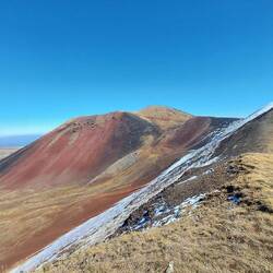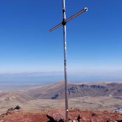 Ich gehe in den Speed Modus über und möchte noch kurz über einen spektakulären Kamm auf den Gipfel aufsteigen. Die Aussicht ist permanent wunderschön, auch wenn ich in Gedanken bei Bianca & Herrn Linguini bin. So bin ich extrem zügig unterwegs & laufe den Weg. Sollte sich die Lage zuspitzen, so können wir den armen Kerl wenigstens gemeinsam tragen. Am Gipfelkreuz angekommen ist der Rundblick bis Aserbaidschan & bis zum Ararat. In der Ferne sehe ich Robur und auch der Sewansee liegt dem Gipfel zu Füßen.