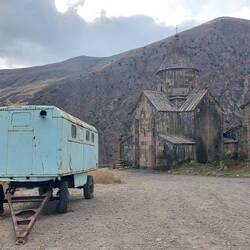 Von Sissian geht es über bergige Straßen zum Kloster Vorotnavank. An einem kleinen Verkaufsstand erstehen wir getrocknete Feigen und Granatapfelwein🍷.