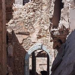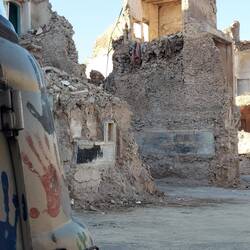 Ich persönlich komme am Samstag, den 17.04.25 in die Stadt. Einen Parkplatz finde ich direkt an der Schnittstelle zwischen zerstörter Altstadt und belebter Innenstadt. So laufe ich umher und verschaffe mir einen Überblick. Ich setze weder auf Trennkost, noch habe ich mir erst die zerstörte Altstadt und dann die lebendige Nachbarschaft angeschaut. Für diesen Footprint habe ich mich aber bewusst für die Differenzierung entschieden. So mache ich also Erkundungsgänge durch Schutt & Asche. Kletter durch Ruinen und verschaffe mir ein Bild. Es ist still, selten Geräusche aus der entfernten Umgebung. Safe prangert an den meisten Gebäuden. Sprich auf Mienen, Kanisterbomben und Co geprüft. Zwischenzeitlich setze ich mich für ein zwei Stunden in ein zerbombtes Haus und lasse die Eindrücke wirken, dann gehe ich in mich gekehrt weiter.