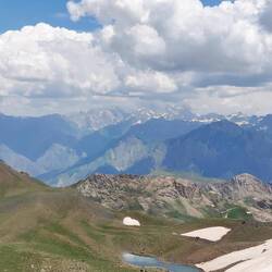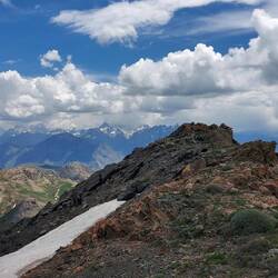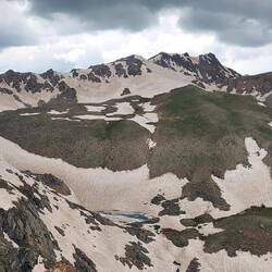 Meine Wanderung startet rein experimentell. Der Verlauf scheint mir logisch. Einzig die Berge dazwischen und die damit verbundenen Überquerungen zeichnen sich erst nach und nach ab. Also step by step. Ich folge Tierwegen und baue meine Eigenen. Hübsche Seen passiere zeugen von der Fruchtbarkeit der Region. Aktuell blüht die Natur auf. Eine tolle Jahreszeit. Bei einer Pause erspähe ich einen Grat. Der Aufstieg steil. Runter sollte es auch wieder gehen. Und ja, der Aufstieg gelingt. Ich folge dem Grat bis auf 3492 Meter Höhe. Dann ist Ende. Ein Felsabruch. Einen See, der hier übrigens das touristische Highlight darstellt (jedes Kind braucht ja einen Namen😅), sehe ich unter mir liegen. Ich beginne in die andere Richtung den Abstieg. Steil durch leichtes Geröll. Leichter Schneefall beginnt.