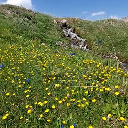 Auch die Hirten und Bauern sind bereits unterwegs. Diese meist hoch zu Roß. Die Pferde haben aktuell Fohlen und folgen dem meist zusätzlich bepaktem Muttertier. Mit hübschen Decken auf dem Rücken, ein schöner Anblick. Das untere Hochtal bis ca. 3100m ist Blumen übersät. Weiter oben ist deutlich weniger Schnee als letztes Jahr und der Frühling beginnt bereits.
