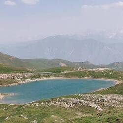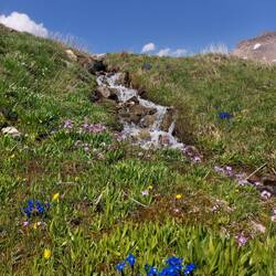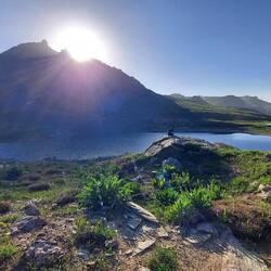 Ich Blicke auf zahlreiche Seen. Einer, recht groß und etwas tiefer gelegen, beeindruckt mich besonders. Hier möchte ich übernachten. Der Weg dorthin verläuft durch eine prachtvoll leuchtende Blütenpracht. Wasser zudem, wie auf der ganzen Wanderung, im Überfluss. Sonst gibt es auf dieser Seite der Berge nichts mehr. Keine Hirten, keine Schafe & Ziegen. Lediglich Natur. Adler & andere Vögel drehen ihre Runden. Die Wildnis fesselt mich. Ich bin in meinem Element.