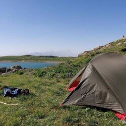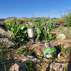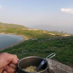 Einen Platz für das Zelt ausfindig zu machen, gar nicht so einfach. Der Wind stark, der Boden oft uneben oder zu exponiert. Es wird letztendlich das bestmögliche. Dann gibt es ein kurzes Bad im See. Traditionell folgen dann die Asia Nudeln in der 120 Gramm Jumbogröße. Immer noch wenig, reicht aber in Verbindung mit Datteln & Co.