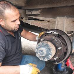 Am Montag geht es dann zurück ins Schrauberviertel. Letztes Jahr lernte ich jemanden kennen, der einen guten Eindruck für diese Arbeit machte. Er erkennt mich sofort und fragt wo Frau und Hund sind. Er freut sich offenbar mich zu sehen. Leider steht sein Hof voll mit LKW's. Aber wegschicken möchte er mich nicht so einfach. Er sagt, er vermittelt mir einen guten Mechaniker und verhandelt den Preis. Wenig später folge ich einem Fahrzeug. Wir gelangen zur Zentrale der Trommelbremsenaufbereitung. Woanders wird zerlegt, hier werden Belege neu genietet und die Trommeln ausgedreht. Bei meinem Fahrzeug wird somit hier heute auch zerlegt. Der Mechaniker gefällt mir nicht zu 100%. Er ist nicht so richtig in seinem Element. Das ist immer das Risiko. Aber es ist auch nicht zum wegrennen. Entspannen kann ich so allerdings nicht. Die Wahl der Werkzeuge ist gruselig. Das zerlegen muss ich zukünftig auch besser selbst übernehmen. Die Trommeln dreht sein Bruder aus. Auch die Nieten setzt dieser. Er macht den ganzen Tag nichts anderes. Das läuft wie ein Länderspiel und macht Spaß zuzuschauen.