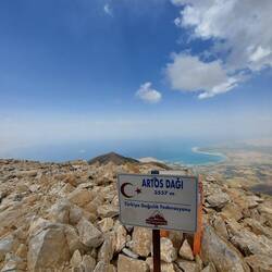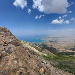 Nachdem die erste Flancke passiert ist, gibt's eine erste Pause. Der zweite Abschnitt liegt nun bereits bei um die 3000m Höhe und wird immer felsiger. Es geht immer an der Gratkante weiter steil aufwärts. Der Ausblick über den Vansee und die Insel Akdamar sind dabei fantastisch 😊.