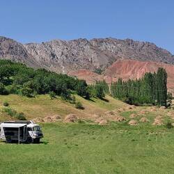 Danach ging es noch ca. 50km weiter. Eine Straße in die Berge zog mich dann magisch nach links. Sie führte durch winzige Ortschaften. Pfirsiche werden hier angebaut und auf den Blechdächern getrocknet. Trockenobst produziert. Ich entdecke eine gemähte Wiese und frage den Bauern, ob ich dort übernachten darf. Kein Problem, Pfirsiche in der Plantage daneben soll ich mir auch pflücken. Gelebte Gastfreundschaft 👍.