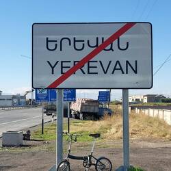 So geht es los. Das Fahrrad halb auf dem Schoß gen Süden. Ich bekomme einen Armenien Schlüsselanhänger geschenkt, dann verabschiedet sich der erste Chauffeur mit seinem russischen Gefährt.