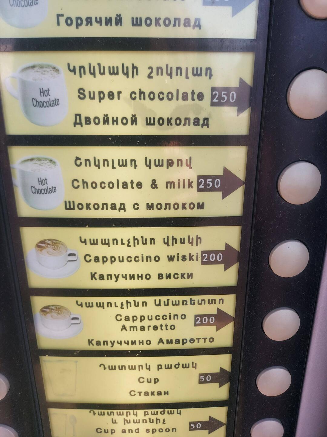 Durchaus üblich in Armenien & für 50cent nicht so übel. Hier gibt es als Besonderheit auch Cappuccino Whiskey, oder mit Amaretto. Hervorragend🤠!
