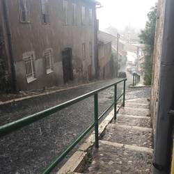 Nicht ganz unten angekommen, werden wir mal wieder von einem Unwetter 🤨 heimgesucht. Innerhalb von Sekunden gewittert und hagelt es ⛈🌫 und reißende Bäche mit Wassermassen rauschen an uns vorbei. So stehen wir hier, mit dem Rücken an die Hauswand gedrückt, um nicht völlig durchnässt zu sein und warten 🤔 ....
