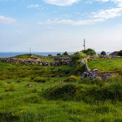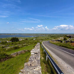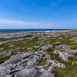 Später fahre ich die Küstenstraße weiter nach Norden und komme in ein sehr bizarres Gebiet, den Burren. Dies ist eine in Irland einzigartige Karklandschaft, ein Karst. Beinahe gepflastert wirkt der graue, poröse Boden, der allerdings an vielen Stellen aufgebrochen ist. Unterirdische Seen haben hier ein weit verzweigtes Netz von Höhlen geschaffen. Oberirdisch findet man eine bemerkenswerte Flora zwischen arktischer und mediterraner Pflanzen, die zwischen den Steinspalten hervorschießt. Es wirkt ähnlich wie bei erkalteten Lavaströmen, die zwar wesentlich schwarzer, aber ähnlich aufgebrochen sind und Pflanzen neuen Lebensraum geben. Das Wort bizarr trifft diese Landschaft wirklich am besten.