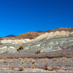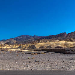 Das ist das Death Valley, einer der heißesten Orte der Welt. Und ganz anders, als ich dachte. Sand ist hier gar nicht so viel zu sehen. Stattdessen ständig abwechselnd Landschaften, bunte Berge, und ein ständiges Auf und Ab - von gut 3.000 ft wieder runter auf (oder sagt man unter?) 100 ft unter dem Meeresspiegel. Und dann noch die reichlich tief fliegenden Düsenjets der Air Force auf Testflügen über dem Rainbow Canyon. Hier wird einem einiges geboten. Hätte nicht gedacht, dass eine Wüste so viele Facetten haben kann. Und diese Hitze, hab ich die schon erwähnt? Dabei ist das lange nicht das Höchste was einem das Thermometer hier zeigen kann... Ich glaub die Leute hier würden heute vielleicht sogar "nur" sagen?