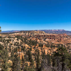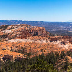 Vom Zion geht es direkt weiter zum nächsten Nationalpark-Highlight, dem Bryce Canyon. Der Begriff Canyon ist eigentlich falsch, da es keine Schlucht im eigentlichen Sinne ist. Vielmehr handelt es sich um eine Abbruchkante, unter der sich über 40 Kilometer hinweg sehr bizarre Säulen, Türmchen und Zinnen durch Wind, Regen und Eis gebildet haben. Dies macht den Park zu einem der spektakulärsten überhaupt. Auch hier hat man wie im Zion einen Shuttlebus, der die Besucher von einem Punkt zum nächsten bringt. Dies erspart einem die Parkplatzsuche, die in der Hochsaison sicher unzumutbar ist. Mein Camper bleibt also direkt vor dem Park stehen. Interessant ist hier, dass man nicht durch den Canyon, sondern an der Seite lang gefahren wird. Hinein kann man nur laufen und dabei weit über 100 Höhenmeter überwinden, bei 35°C ein Spaß. Ich fürchte wenn ich einmal unten bin, komme ich nicht mehr wieder hoch. Ich laufe stattdessen ein Stück den Rim Trail am oberen Rand entlang und genieße die Aussicht. Die vielen verschiedenen Formen und ihre Farben sind wirklich beeindruckend. Diesen Park sollte man auf keinen Fall auslassen.