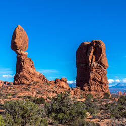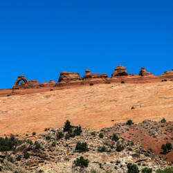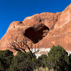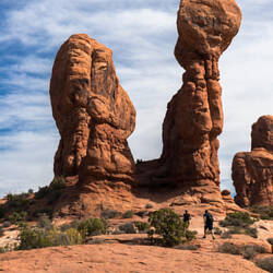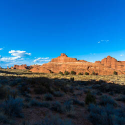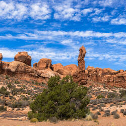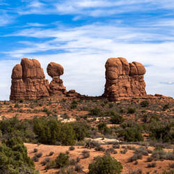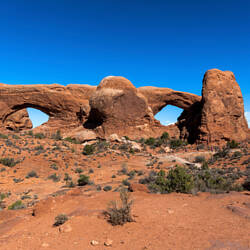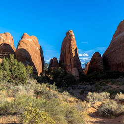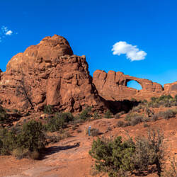 Also, Moab, hier habe ich ganze vier Übernachtungen eingeplant. Eigentlich waren es drei, aber dann kam doch tatsächlich mal ein bißchen schlechtes Wetter dazwischen. Am Sonntag strahlt noch die Sonne und ich entschließe mich, trotz Wochenende in den Arches National Park zu fahren - eine gute Entscheidung. Der Park ist eigentlich der, auf den ich mich am meisten gefreut habe. Hier gibt es so viele, durch Erosion in Wind und Wetter entstandene Felsformationen, insbesondere Felsbögen zu sehen. Es führt über einige Meilen eine Straße durch den Park, mit kleinen Abzweigungen. Es ist wirklich toll hier. Für den Tag habe ich mir "sämtliche" Aussichtspunkte sowie die kleinen Wanderungen zum Double Arch und den Windows vorgenommen. Zum Dedicate Arch muss ich eigentlich nicht hochkraxeln. Die Bögen sind echt beeindruckend, vor allem der Double Arch.