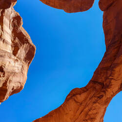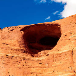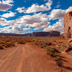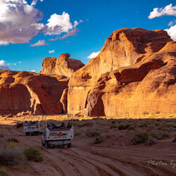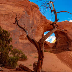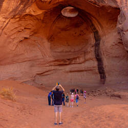 Wenn man wie ich mit einem Wohnmobil kommt, hat man nicht wirklich viele Möglichkeiten, außer den geführten Touren (durch die Navajo). Es führen unbefestigte Straßen durch das Tal, die mit normalen Auto oder besser Allrad befahren werden dürfen, nicht aber mit RVs. So buche ich eine 2,5-stündige Tour und muss erstmal auf weitere Teilnehmer warten. Etwas nervig, aber es geht irgendwann doch los. Im offenen Pickup werden wir durchs Tal chaufiert, auch in Teile, die man mit dem Privatwagen nicht fahren darf. Der Grund ist offensichtlich: eine nur durch Fahrspuren zu erkennende Buckelpiste durch den roten Sand. Auch wenn unser Guide ein guter Fahrer ist, ein wenig schlecht kann einem dabei schon werden. Er bringt uns an einige schöne Stellen, zeigt uns Arches und eine kleine Navajo Siedlung. Meine französischen Mitreisenden scheinen nur die Hälfte zu verstehen und tatsächlich höre sogar ich den Akzent. Die Navajo scheinen unterdess ein sehr phantasiereiches Volk zu sein. Alle Formationen haben Namen, auch wenn manchmal schwer zu erkennen ist, wo sich der Namensgeber in der Formation findet. Schön finde ich auch, wie wir mit Gesang der Navajo am Felsen unter einem Loch im Felsen gen Himmel liegen - aber Entschuldigung, das ist kein Loch, sondern das Auge des Adlers. Eine schöne Tour.