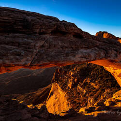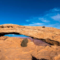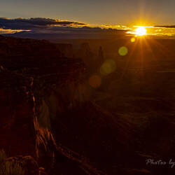 Am Montag geht es in den Nationalpark nebenan. Der Canyonsland ist riesig und unterteilt sich in drei voneinander durch Flüsse getrennte Gebiete: dem Island in the Sky Distrikt, dem Needles Distrikt und dem so gut wie nicht zugänglichem Maze District. Ich besuche das Hochplateau Island in the Sky. Diese Gegend ist irgendwie ganz anders als der Arches. Der Park ist greifbar, man kann in einer halben Stunde zum Ende fahren. Aber Island in the Sky? Die Straßen hier sind durch kürzer und an einem halben Tag machbar, aber alles, was man hier sieht, lässt einen so unfassbar klein wirken. Meilen über Meilen von Canyons überschaut man, ohne ein Ende zu erkennen. Auch gibt es den tollen Mesa Arch zu bewundern, der Grund, warum ich einen Tag länger bleiben wollte. Dieser Arch muss bei Sonnenaufgang toll aussehen! Es gibt da nur ein schon erwähntes Problem, ich habe die Regentage hier erwischt. Und dennoch habe ich mich aufgerafft, um 6 Uhr morgens geht's Richtung Mesa Arch. Der Parkplatz ist schon gefüllt, aber nicht so sehr wie ich dachte. Die Ankunft am Arch ist aber ernüchternd. Alle haben sich direkt vor dem Bogen postiert und ich versteh nicht warum. Der Bogen sieht so toll aus, aber so bekommen die den doch nie ganz drauf und knipsen nur die Sonne. Anfänger! Aber es muss so gehen. Nervig sind am Ende aber besonders die ewigen Poster, besonders die asiatischer Natur. Als ob alle anderen auch ein Photo mit denen haben wollen?