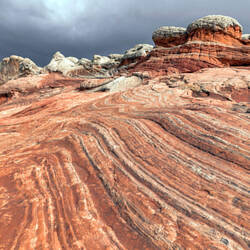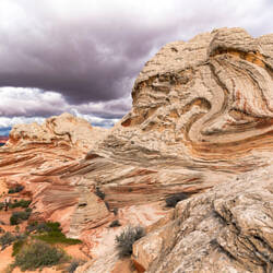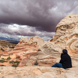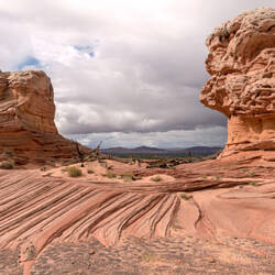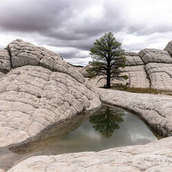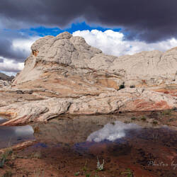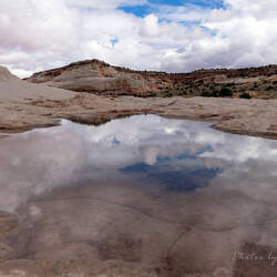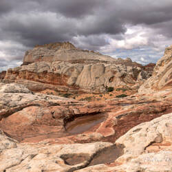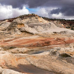 Nach gut einer Stunde Schaukeln kommen wir endlich an, noch durch eine schöne große Pfütze und gut. Am Anfang wird einem noch nicht ganz klar, was sich hier verbirgt, aber nach einer kurzen Wanderung kommen wir zu weißen Sandsteingebilden, die einen Teil des Namens ausmachen. Es wirkt ein wenig bizarr, auf den weißen Steinen zu klettern. Der zweite Namensteil kommt von den Wasseransammlungen (eigentlich nur einer ganz bestimmten), die sich bei Regen bilden. Ein paar Meter weiter wird es dann bunter, der bekannte rote Sandstein mischt sich wieder unter und es entstehen tolle farbige Formationen. Ein Paradies für Photographen, wenn das Wetter mitspielt. Nur ist dies heute das erste Mal auf meiner Reise nicht der Fall. Am Vormittag haben wir noch ein schönes Wechselspiel aus Sonne und Wolken. Nach unserem Lunch ändert das sich nur leider sehr schnell. Eigentlich wollte uns Orion das Highlight der Gegend zeigen, eine große Senke mit unendlich vielen Motiven. Aber leider hat es sich eingerechnet, wir versuchen es in einer Höhle auszusitzen, aber leider hilft auch das nicht. Nach einer Stunde im Regen hat keiner von uns mehr Lust, auch wenn Orion es uns frei stellt, im Auto zu warten oder Fotos machen. Es ist richtig kalt geworden und wir sind nass. Also geht's gegen halb vier wieder zurück nach Kanab.