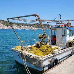 Stop in Galatas. Wir haben einen tollen Blick über die Bucht nach Poros. Zwischen den beiden Städten verkehren Fähren und Wassertaxis.