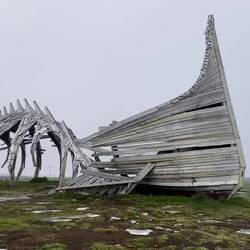 Das ist eine Skulptur aus Holz. Der vordere Teil ist einem Vikingerschiff nachempfunden, der hintere Teil erinnert an einen Walfisch.