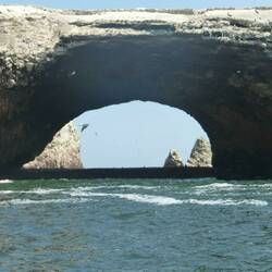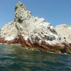 15 minuten later komen we aan bij de Ballestas eilandjes. Zwermen zeeleeuwen, aasgieren, aalschovers en enkele Humboldt pinguïns verwelkomen ons. De eilanden zijn bedekt met een laag guano, de uitwerpselen van de vele vogels. Deze shit is populair want het is een zeer goede organische meststof waar veel geld voor betaald wordt. Dus komen hier elk jaar een bende arbeiders met houwelen en schoppen de drek verzamelen om later te kunnen verkopen.