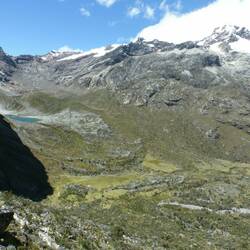 Iets verderop begint onze wandeling. Gids David vertelt ons dat het ongeveer 3 uur zal duren om boven te geraken. We zitten nu op 3900m hoogte en zullen stijgen naar 4600m. Dat wordt geen lachertje. De eerste 2 kilometers lopen we door een groene vlakte langs kuddes koeien en kleine riviertjes. Enkele witte pieken domineren de horizon, zowel voor als achter ons.