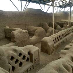 De laatste dag doe ik een uitstap naar de ruïnes van Chan Chan terwijl Vé uitrust in het hotel. Net buiten Trujillo, in woestijnachtig gebied, liggen 9 grote tempels. Slechts 1 ervan is momenteel open voor bezoekers. De sympathieke Alfred is hier al 40 jaar gids en leidt mij rond in het complex. De Chimu beschaving die hier leefde ontstond al lang vóór de Inca’s en regeerde ongeveer 9 eeuwen. Ze aanbaden meerdere goden zoals de maan en eerden alles wat uit de zee kwam. Dat is te zien in de decoratie op muren en altaren. Krabben, vissen, visnetten, pelikanen, golven, de maan,… al deze symbolen komen steeds terug in hun ontwerpen.