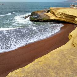 Voor de tocht naar het Paracas national reserve springen we op een huurfiets. Na 4km bereiken we de ingang van het reservaat. Links van ons liggen grote gekleurde zandduinen en rechts ligt de oceaan. Na een stevige klim op onze kleinste versnelling passeren we het visitor center. Daarna wordt het terug iets vlakker en een paar kilometer verder bereiken we Playa Roja. Dit mooie rode strand dankt zijn kleur aan stukjes van een verder gelegen rots die afbrokkelen en hier aanspoelen.