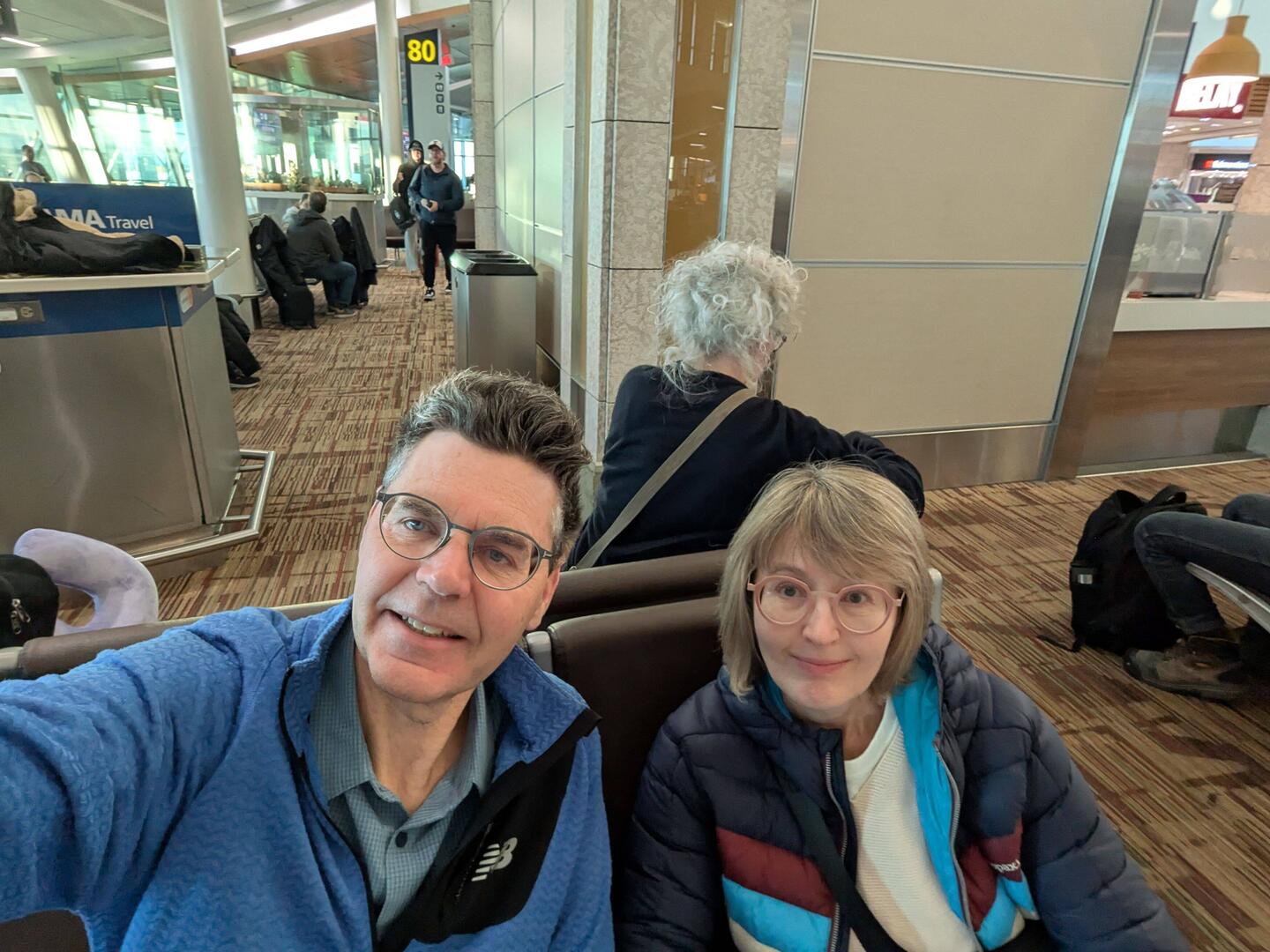 We were away at 6 am from the house. My daughter Madeline was good enough to drive us to the airport which is commendable as Madeline is 19 and not always a morning person. I hadn't been able to check in prior to departure. Delta had changed our flight times but hadn't reissued our tickets. It took the WestJet employee a long time to print our boarding passes. She had to call WestJet support for help. Eventually they got it all sorted out and we were able to get to the gate with lots of time. After boarding the flight, the crew realized that a piece of equipment needed changing so we sat at the gate on the plane for an hour. I was very thankful for our 3 hour lay over in Minneapolis which was reduced to 2. We were in zone 7 for the Atlanta flight. They had called for volunteers to check their carry on but because we had a tighter connection had decided against it. We hugged the gate for loading and were the first to get on of the zone 7 group and shortly afterwards they cut off the carryon luggage. The seats were much more comfortable than our previous WestJet flight with wider seats and more legroom. Atlanta has a big airport. There is a large train that moves people between terminals. We initially thought we were flying out of E terminal but when we showed up at the gate the only people there were a couple of Mormon missionaries. They were off to BA as well to mentor and supervise younger missionaries. We realized they had changed the gate to terminal F so we had to go back downstairs and get on the train again to get to terminal F. Still lots of time at the gate. I had paid a little more money for some more leg room which was worth it as I didn't feel cramped at all.