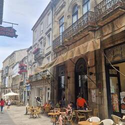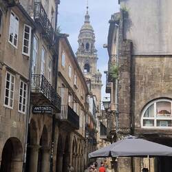 Mittagessen? Klar! Mit Blick auf die Kathedrale 😋 – Garnelen in Currysauce, dazu das Treiben der Pilger, die mit ihren weißen Muscheln 🐚 an den Rucksäcken vorbeizogen.