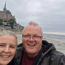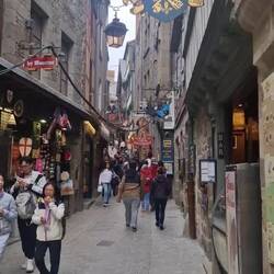 300 Stufen. Die Spitze des Felsens. Ich bin sofort raus und habe mir einen strategischen Rückzugspunkt gesucht: ein romantisches Café mit Blick über das Watt. ☕️ Doch als ich so am Staunen war, sah ich sie! Ganz, ganz oben, am Fuß der Abtei! 👋 Britti stand siegreich auf dem Gipfel, ein Grinsen, so breit wie die Bucht. Sie hatte es geschafft und war völlig überwältigt von diesem historischen Bauwerk. 😍