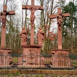 Gegen Ende der Wanderung entdecke ich eine Kreuzigungsgruppe auf dem Kalvarienberg, von wo ich einen Kreuzweg hinunter nach Karlstadt gehe.